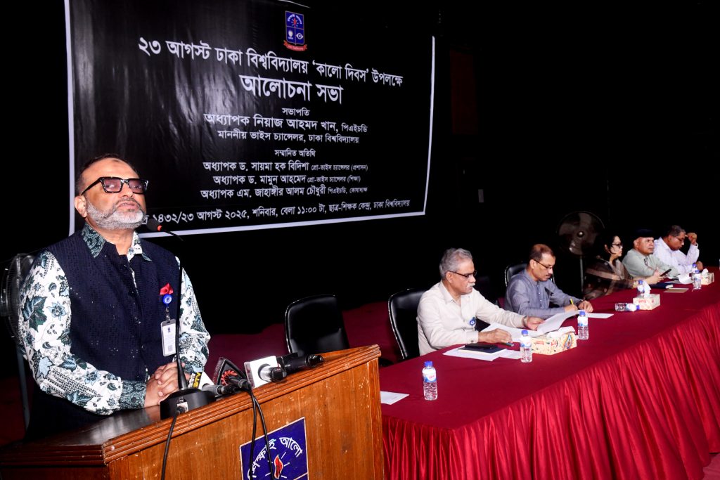 ঢাকা বিশ্ববিদ্যালয় কালো দিবস উপলক্ষে এক আলোচনা সভা আজ ২৩ আগস্ট ২০২৫ শনিবার ছাত্র-শিক্ষক কেন্দ্রের (টিএসসি) মিলনায়তনে অনুষ্ঠিত হয়েছে। অনুষ্ঠানে সভাপতিত্ব করেন বিশ্ববিদ্যালয়ের উপাচার্য অধ্যাপক ড. নিয়াজ আহমদ খান।