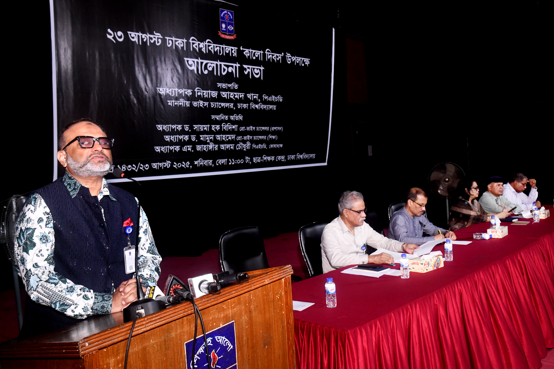 ঢাকা বিশ্ববিদ্যালয় কালো দিবস উপলক্ষে এক আলোচনা সভা আজ ২৩ আগস্ট ২০২৫ শনিবার ছাত্র-শিক্ষক কেন্দ্রের (টিএসসি) মিলনায়তনে অনুষ্ঠিত হয়েছে। অনুষ্ঠানে সভাপতিত্ব করেন বিশ্ববিদ্যালয়ের উপাচার্য অধ্যাপক ড. নিয়াজ আহমদ খান।