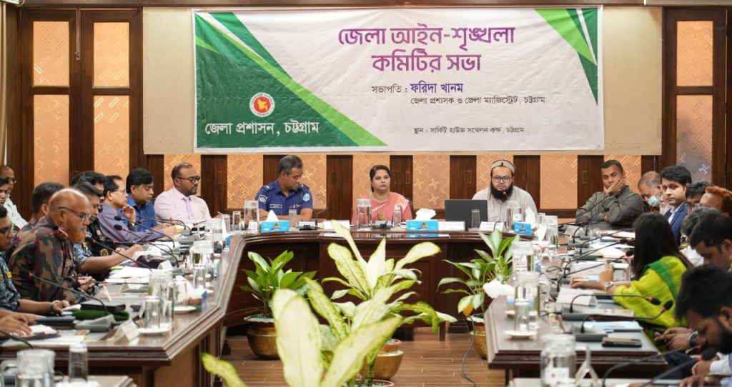 চট্টগ্রাম জেলা আইন-শৃঙ্খলা কমিটির মাসিক সভা চট্টগ্রাম সার্কিট হাউসের সম্মেলন কক্ষে জেলা প্রশাসক ও জেলা ম্যাজিস্ট্রেট ফরিদা খানমের সভাপতিত্বে অনুষ্ঠিত হয়। সভায় জেলা ও মহানগর এলাকার আইন-শৃঙ্খলা পরিস্থিতি উন্নয়নে গুরুত্বপূর্ণ বেশ কিছু সিদ্ধান্ত গ্রহণ করা হয়।